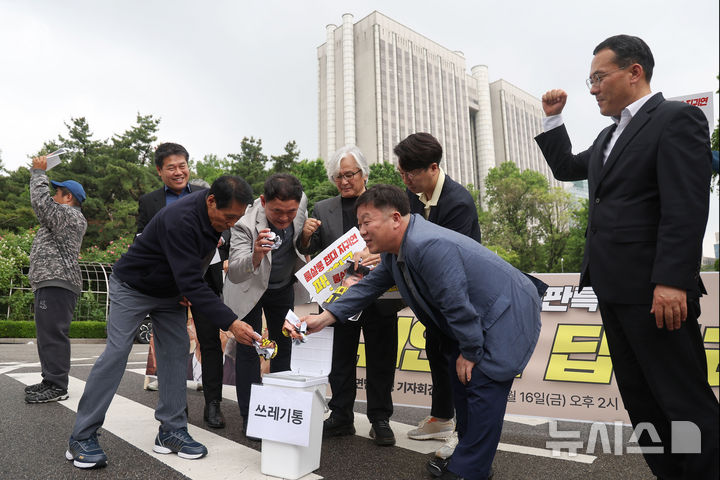 [서울=뉴시스] 김선웅 기자 = 촛불행동, 검사를 검사하는 변호사 모임, 민생경제연구소 등 단체 관계자들이 16일 서울 서초구 서울중앙지법 앞에서 기자회견을 열고 지귀연 판사에 대한 면담을 요구하며 윤석열 전 대통령 재판 특혜, 불법 접대 등 의혹에 대한 해명을 촉구하는 퍼포먼스를 하고 있다. 2025.05.16. [email protected]