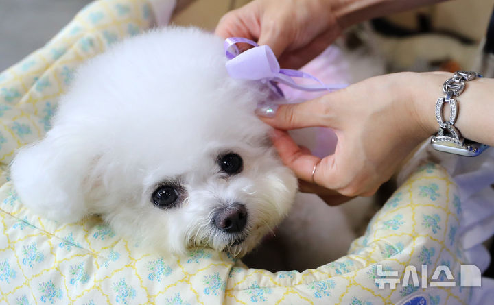 [고양=뉴시스] 김혜진 기자 = 16일 경기 고양시 킨텍스에서 열린 2025 메가주 일산에서 강아지가 반려견 유아차에 앉아 있다. 2025.05.16. [email protected]