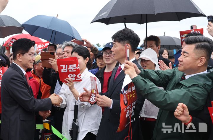 [세종=뉴시스] 조성봉 기자 = 김문수 국민의힘 대선후보가 16일 세종시 국회 세종의사당 부지 입구에서 행정수도 공약 발표를 하기 전 지지자들과 인사하고 있다. 2024.05.16. [email protected]