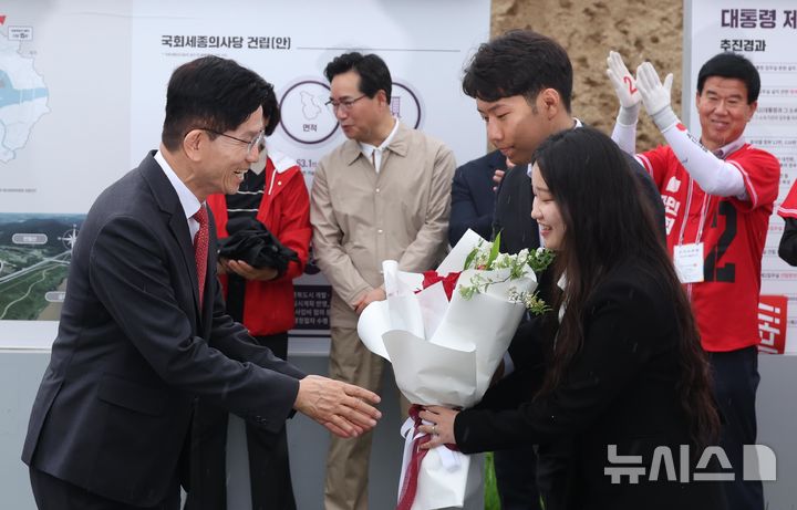 [세종=뉴시스] 조성봉 기자 = 김문수 국민의힘 대선후보가 16일 세종시 국회 세종의사당 부지 입구에서 행정수도 공약 발표를 하기 전 대학생 당원들에게 꽃다발을 받고 있다. 2024.05.16. [email protected]