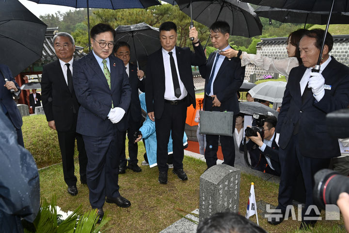 [광주=뉴시스] 박기웅 기자 = 우원식 국회의장이 16일 오후 광주 북구 운정동 국립5·18민주묘지를 찾아 헌화·분향한 뒤 고(故) 박금희 열사 묘 앞에서 참배하고 있다. 2025.05.16. [email protected]