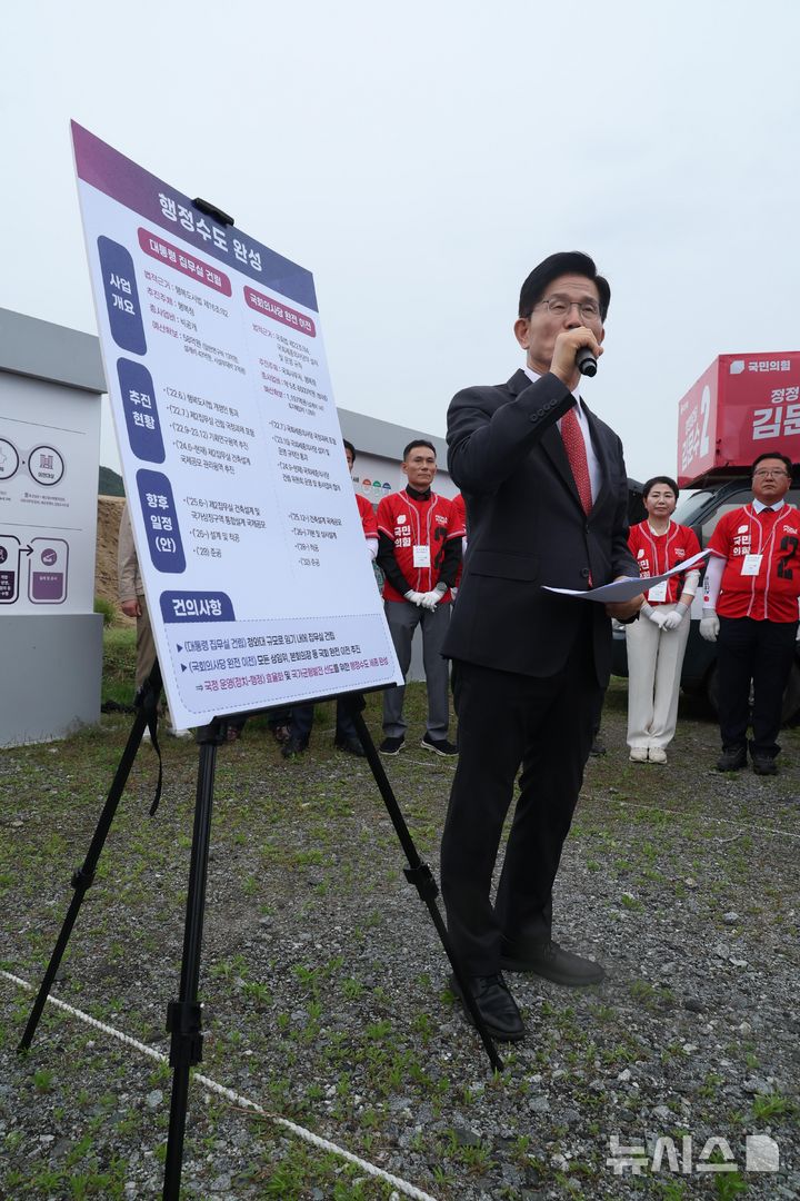 [세종=뉴시스] 조성봉 기자 = 김문수 국민의힘 대선후보가 16일 세종시 국회 세종의사당 부지 입구에서 행정수도 공약 발표를 하고 있다. 2024.05.16. [email protected]