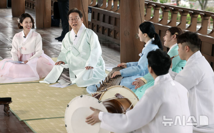 [전주=뉴시스] 조성우 기자 = 이재명 더불어민주당 대선 후보가 16일 오후 전북특별자치도 전주시 완산구 청연루에서 열린 K-컬처 ‘전통의 소리를 잇다-청년 국악인과의 간담회‘에 참석해 청년 국악인들의 연주를 듣고 있다. (공동취재) 2025.05.16. [email protected]