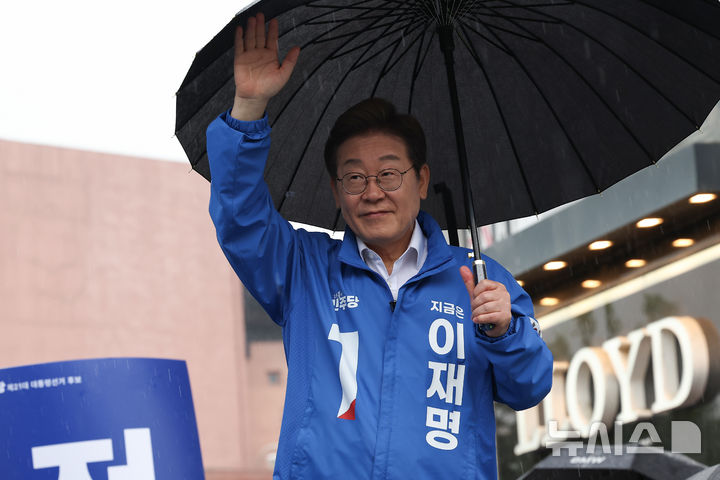 [전주=뉴시스] 조성우 기자 = 이재명 더불어민주당 대선후보가 16일 전북 전주시 전북대 후문에서 열린 유세에서 손을 흔들고 있다. (공동취재) 2025.05.16. [email protected]