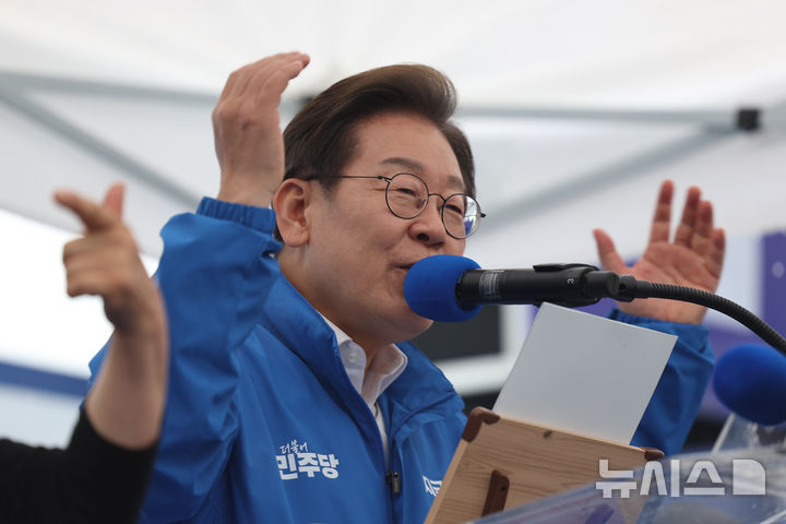 [전주=뉴시스] 조성우 기자 = 이재명 더불어민주당 대선후보가 16일 전북 전주시 전북대 후문에서 열린 유세에서 지지를 호소하는 연설을 하고 있다. (공동취재) 2025.05.16. [email protected]