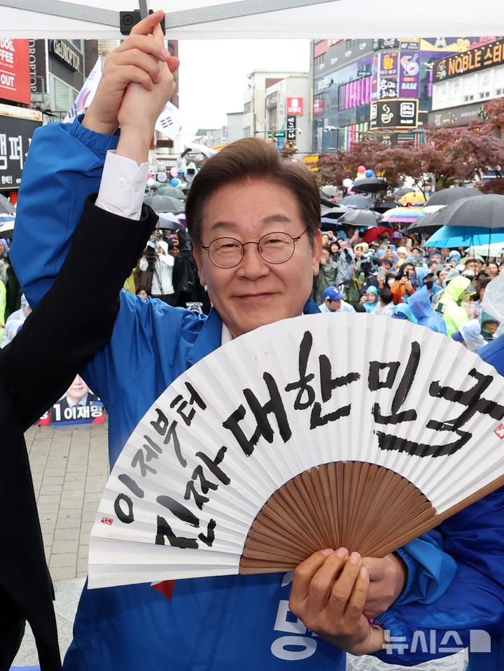[전주=뉴시스] 조성우 기자 = 이재명 더불어민주당 대선후보가 16일 전북 전주시 전북대학교 후문 앞에서 열린 집중유세에서 '이제부터 진짜 대한민국'이라고 적힌 부채(합죽선)를 들어 보이고 있다. 2025.05.16. [email protected]