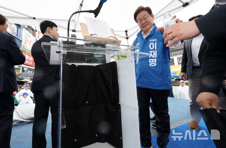 [전주=뉴시스] 조성우 기자 = 이재명 더불어민주당 대선후보가 16일 전북 전주시 전북대학교 후문 앞에서 열린 집중유세에 참석한 가운데 발언대에 방탄패드가 부착돼 있다. 2025.05.16. [email protected]