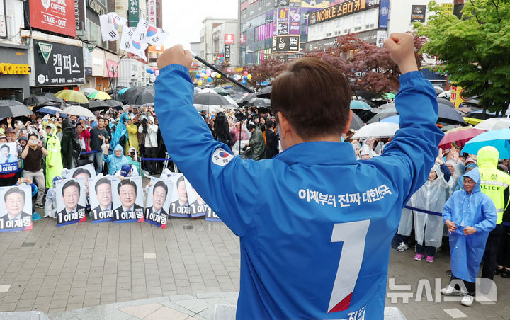 [전주=뉴시스] 조성우 기자 = 이재명 더불어민주당 대선후보가 16일 전북 전주시 전북대학교 후문 앞에서 열린 집중유세에서 지지를 호소하고 있다. 2025.05.16. [email protected]