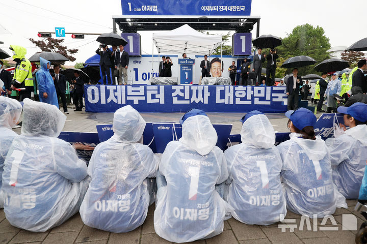 [전주=뉴시스] 조성우 기자 = 이재명 더불어민주당 대선후보가 16일 전북 전주시 전북대학교 후문 앞에서 열린 집중유세에서 지지를 호소하고 있다. 2025.05.16. [email protected]