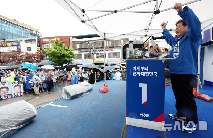 [전주=뉴시스] 조성우 기자 = 이재명 더불어민주당 대선후보가 16일 전북 전주시 전북대학교 후문 앞에서 열린 집중유세에서 연설에 앞서 인사하고 있다. 2025.05.16. [email protected]