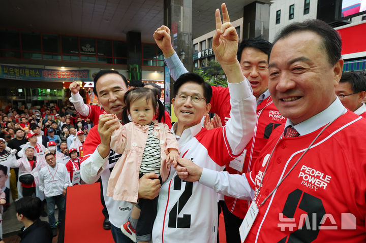 [청주=뉴시스] 조성봉 기자 = 김문수 국민의힘 대통령 후보가 16일 오후 충북 청주시 상당구 성안길에서 가진 유세에서 아이를 안고 손을 들어 인사하고 있다.(공동취재) 2025.05.16. [email protected]