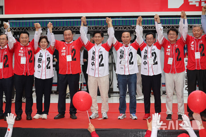 [청주=뉴시스] 조성봉 기자 = 김문수 국민의힘 대선후보와 선거대책위 관계자들이 16일  충북 청주시 올리브영 청주타운 앞에서 열린 집중 유세에서 손을 잡고 시민들에게 지지를 호소하고 있다. (공동취재) 2025.05.16. [email protected]