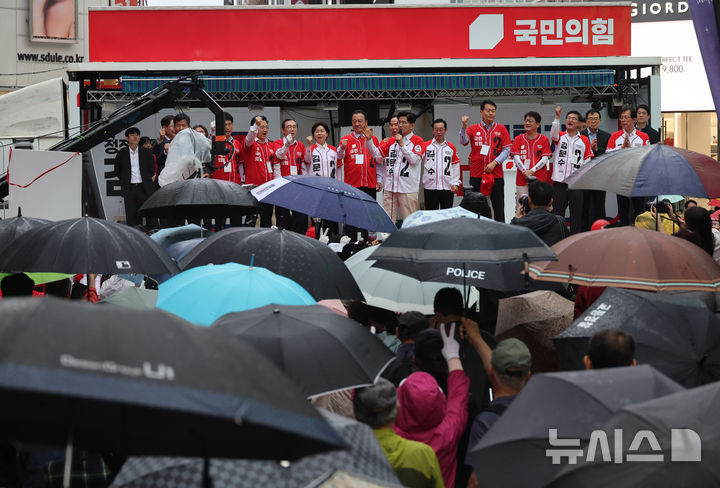 [청주=뉴시스] 조성봉 기자 = 김문수 국민의힘 대선후보가 16일 충북 청주시 올리브영 청주타운 앞에서 열린 집중 유세에서 시민들에게 지지를 호소하고 있다. (공동취재) 2025.05.16. [email protected]