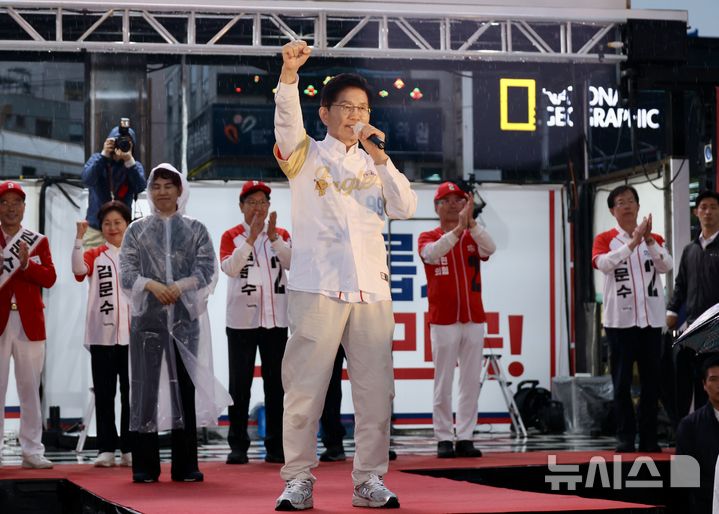 [대전=뉴시스] 조성봉 기자 = 김문수 국민의힘 대선후보가 16일 대전 중구 으능정이 거리에서 열린 유세에서 한화이글스 유니폼을 입고 시민들에게 지지를 호소하고 있다.2025.05.16. [email protected]