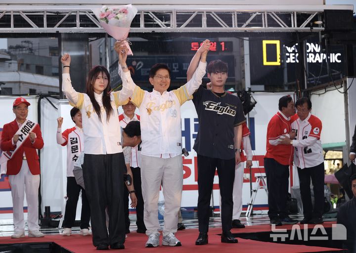 [대전=뉴시스] 조성봉 기자 = 김문수 국민의힘 대선후보가 16일 대전 중구 으능정이 거리에서 열린 유세에서 한화이글스 유니폼을 입고 대학생 당원들과 시민들에게 지지를 호소하고 있다.2025.05.16. [email protected]
