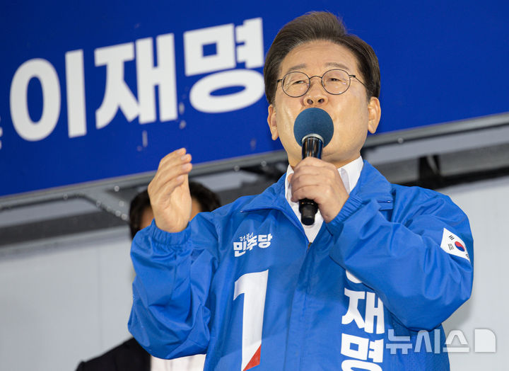 [정읍=뉴시스] 조성우 기자 = 이재명 더불어민주당 대선후보가 16일 전북 정읍시 정읍역 광장에서 열린 유세에서 연설하고 있다. (공동취재) 2025.05.16. [email protected]