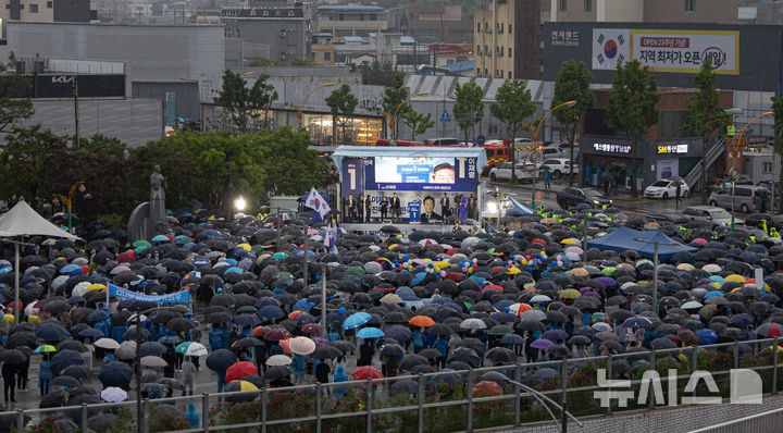 [정읍=뉴시스] 조성우 기자 = 이재명 더불어민주당 대선후보가 16일 전북 정읍시 정읍역 광장에서 열린 유세에서 연설을 하는 가운데 시민들이 우산을 쓰고 유세를 지켜보고 있다. (공동취재) 2025.05.16. [email protected]