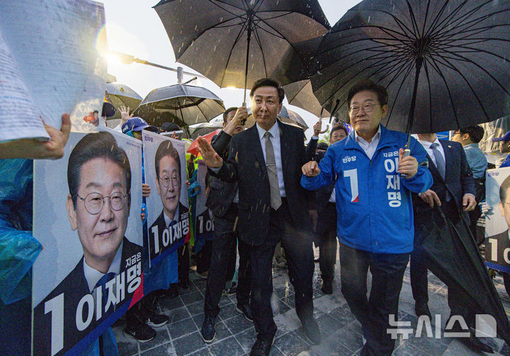 [정읍=뉴시스] 조성우 기자 = 이재명 더불어민주당 대선후보가 16일 전북 정읍시 정읍역 광장에서 유세를 마친 후 차량으로 이동하고 있다. (공동취재) 2025.05.16. [email protected]