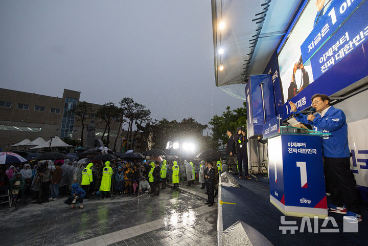 [정읍=뉴시스] 조성우 기자 = 이재명 더불어민주당 대선후보가 16일 전북 정읍시 정읍역 광장에서 열린 유세에서 연설하고 있다. (공동취재) 2025.05.16. [email protected]