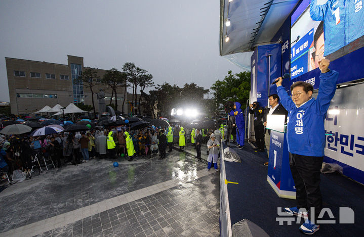[정읍=뉴시스] 조성우 기자 = 이재명 더불어민주당 대선후보가 16일 전북 정읍시 정읍역 광장에서 두 손을 들어 시민들에게 인사하고 있다. (공동취재) 2025.05.16. [email protected]