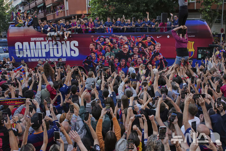 [바르셀로나=AP/뉴시스] FC 바르셀로나 선수들이 16일(현지 시간) 스페인 바르셀로나에서 무개 버스를 타고 팬들의 환호 속에 2024-25 스페인 라리가 우승을 자축하는 퍼레이드를 펼치고 있다. 바르셀로나는 전날 에스파뇰과의 경기에서 승리하면서 잔여 경기에 상관없이 리그 우승을 확정 지었다. 2025.05.17.