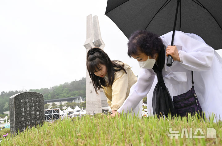 [광주=뉴시스] 김혜인 기자 = 5·18민주화운동 45주기를 하루 앞둔 17일 오전 광주 북구 운정동 국립5·18민주묘지에서 희생자의 부인이 손녀와 먼저 떠나보낸 남편의 묘역을 찾아 풀을 다듬고 있다. 2025.05.17. [email protected]