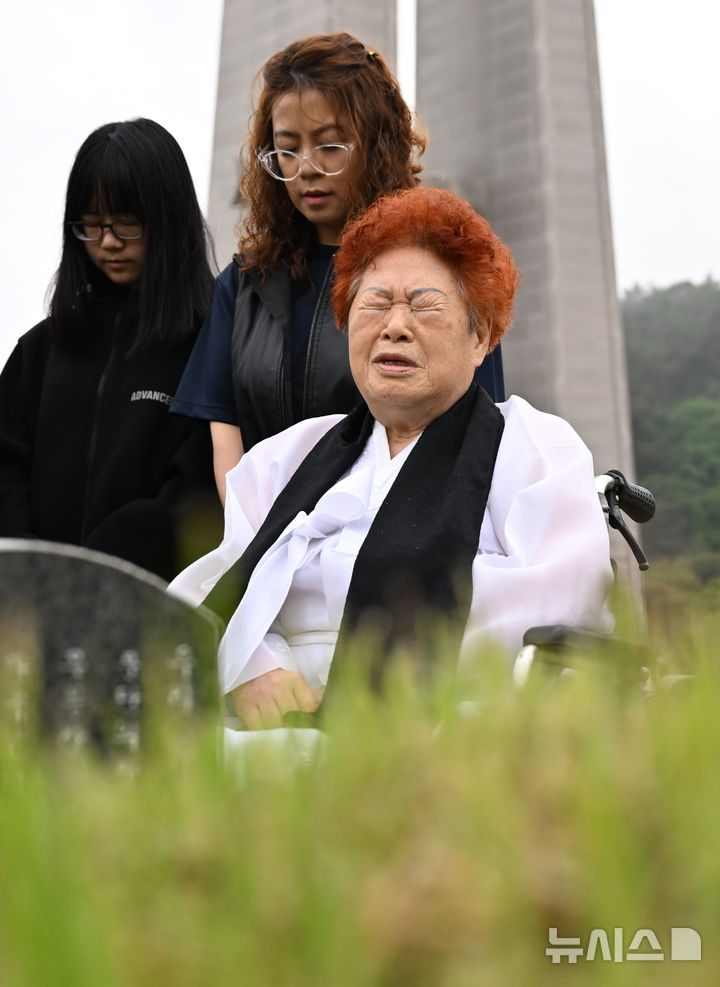 [광주=뉴시스] 김혜인 기자 = 5·18민주화운동 45주기를 하루 앞둔 17일 오전 광주 북구 운정동 국립5·18민주묘지에서 안성례 전 오월어머니 관장이 민주화운동 당시 수습대책위원으로 활동한 남편 명노근씨의 묘역을 찾아 울부짖고 있다. 2025.05.17. [email protected]