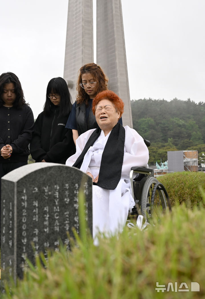 [광주=뉴시스] 김혜인 기자 = 5·18민주화운동 45주기를 하루 앞둔 17일 오전 광주 북구 운정동 국립5·18민주묘지에서 안성례 전 오월어머니 관장이 민주화운동 당시 수습대책위원으로 활동한 남편 명노근씨의 묘역을 찾아 울부짖고 있다. 2025.05.17. [email protected]