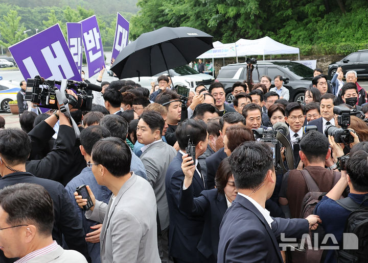 [광주=뉴시스] 조성봉 기자= 김문수 국민의힘 대통령 후보와 김용태 비상대책위원장이 17일 오전 광주 북구 5.18민주묘지를 찾아 참배하기 위해 이동하고 있다. (공동취재) 2025.05.17. [email protected]