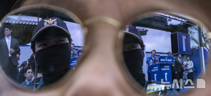 [나주=뉴시스] 조성우 기자 = 17일 전남 나주시 금성관 망화루 앞에서 열린 더불어민주당 이재명 대선후보 유세를 찾은 시민이 쓴 선글라스에 유세장 풍경이 투영돼 있다. (공동취재) 2025.05.17. [email protected]