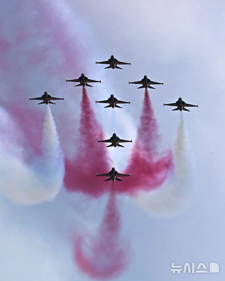 [수원=뉴시스] 김종택 기자 = 17일 경기 수원 공군기지에서 열린 '스페이스 챌린지 2025 in 수원'에서 공군 특수비행팀 블랙이글스가 멋진 에어쇼를 선보이고 있다. 2025.05.17. [email protected]