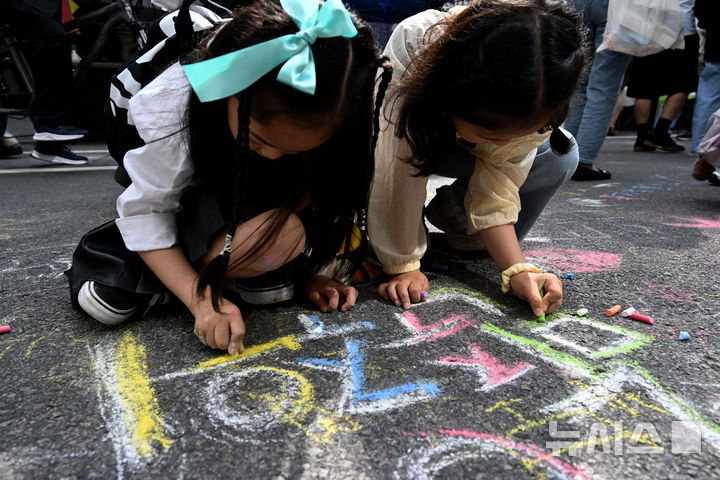[광주=뉴시스] 김혜인 기자 = 5·18민주화운동 45주년 전야제 부스가 마련된 17일 오후 광주 동구 금남로에서 시민들이 오월정신을 되새기는 문구를 바닥에 적고 있다. 2025.05.17. [email protected]