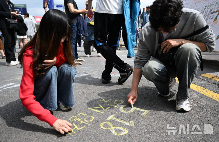 [광주=뉴시스] 김혜인 기자 = 5·18민주화운동 45주년 전야제 부스가 마련된 17일 오후 광주 동구 금남로에서 시민들이 오월정신을 되새기는 문구를 바닥에 적고 있다. 2025.05.17. [email protected]