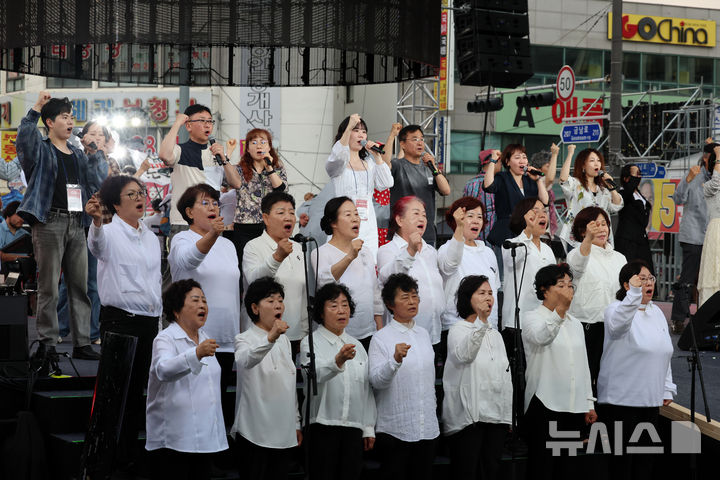 [광주=뉴시스] 이영주 기자 = 5·18민주화운동 45주기를 하루 앞둔 17일 오후 광주 동구 금남로에서 열린 5·18전야제에서 오월어머니들이 '5·18 어매'를 부르고 있다. 2025.05.17.  [email protected]