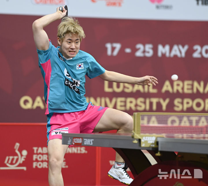 [도하(카타르)=뉴시스] 사진공동취재단 =오준성이 17일 (현지 시간) 카타르 도하 카타르대학교 스포츠 콤플렉스에서 열린 2025 세계탁구선수권대회 개인단식 128강에서 에피오피아 DARARA DUFERA와 경기를 펼치고 있다. 2025.05.18. [email protected]