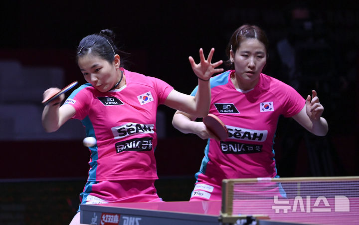 [서울=뉴시스] 사진공동취재단 = 김나영, 이은혜가 17일 (현지 시간) 카타르 도하 루사일 스포츠 아레나에서 열린 2025 국제탁구연맹(ITTF) 세계선수권대회 여자복식 64강에서 스웨덴 린다 베리스트롬(LINDA BERGSTROM), 크리스티나 켈베리(CHISTINA KALLBERG)조와 경기를 펼치고 있다. 2025.05.18. [email protected]