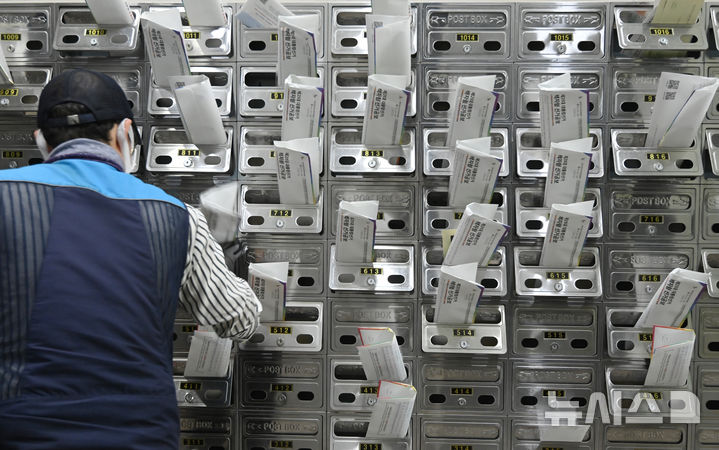 [수원=뉴시스] 김종택 기자 = 18일 경기 수원시 권선구 한 오피스텔 건물에서 우체국 집배원이 제21대 대통령선거 안내문과 선거공보물을 우편함에 넣고 있다. 2025.05.18. [email protected]