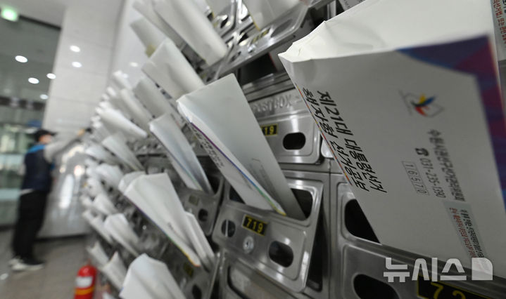 [수원=뉴시스] 김종택 기자 = 18일 경기 수원시 권선구 한 오피스텔 건물에서 우체국 집배원이 제21대 대통령선거 안내문과 선거공보물을 우편함에 넣고 있다. 2025.05.18. [email protected]