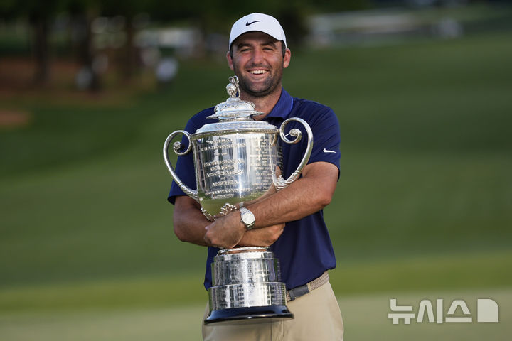 [샬럿=AP/뉴시스] 스코티 셰플러(미국)가 18일(현지 시간) 미 노스캐롤라이나주 샬럿의 퀘일 홀로 클럽에서 열린 미국프로골프(PGA) 투어 PGA 챔피언십 정상에 올라 워너메이커 트로피를 품에 안고 포즈를 취하고 있다. 셰플러는 최종 합계 11언더파 273타로 우승하며 시즌 2승째를 기록했다. 2025.05.19.