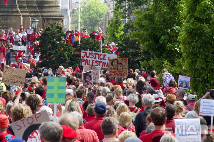 [헤이그=AP/뉴시스] 18일(현지 시간) 네덜란드 헤이그에서 반전 시위 ‘레드라인 시위’가 열리고 있다. 이 시위는 이스라엘의 가자지구 군사 작전에 대해 네덜란드 정부의 보다 강경한 대응을 촉구하기 위해 열렸다. 국제 인권 단체와 구호 기관들은 이날 열린 평화 시위에 10만 명 넘는 인파가 참여한 것으로 추산했다. 2025.05.19.