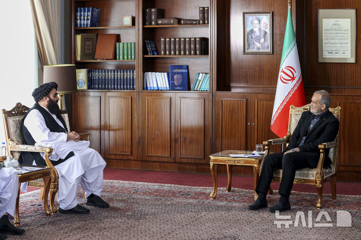 [테헤란=AP/뉴시스] 마수드 페제시키안(오른쪽) 이란 대통령이 18일(현지 시간) 테헤란에서 아미르 칸 무타키 아프가니스탄 외무장관과 회담하고 있다. (사진=이란 대통령실 제공) 2025.05.19.