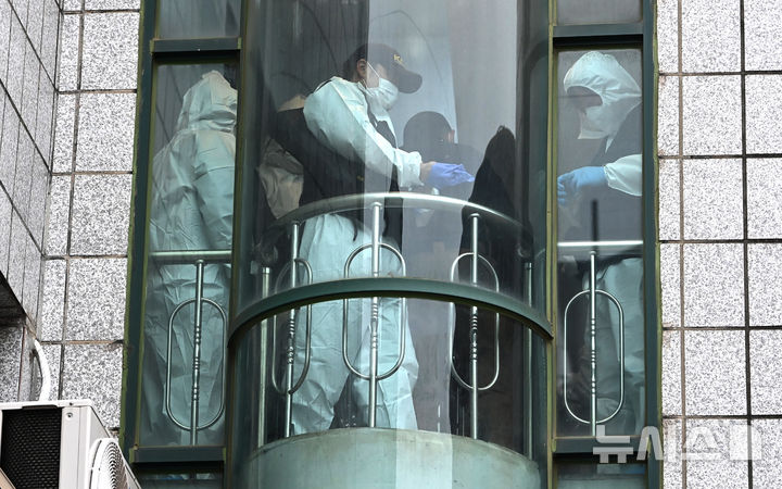 [시흥=뉴시스] 김종택 기자 = 50대 중국동포가 시민을 잇달아 흉기로 찌르는 사건이 발생한 19일 경기 시흥시 정왕동 사건현장에서 과학수사대가 현장 감식을 하고 있다. 2025.05.19. [email protected]