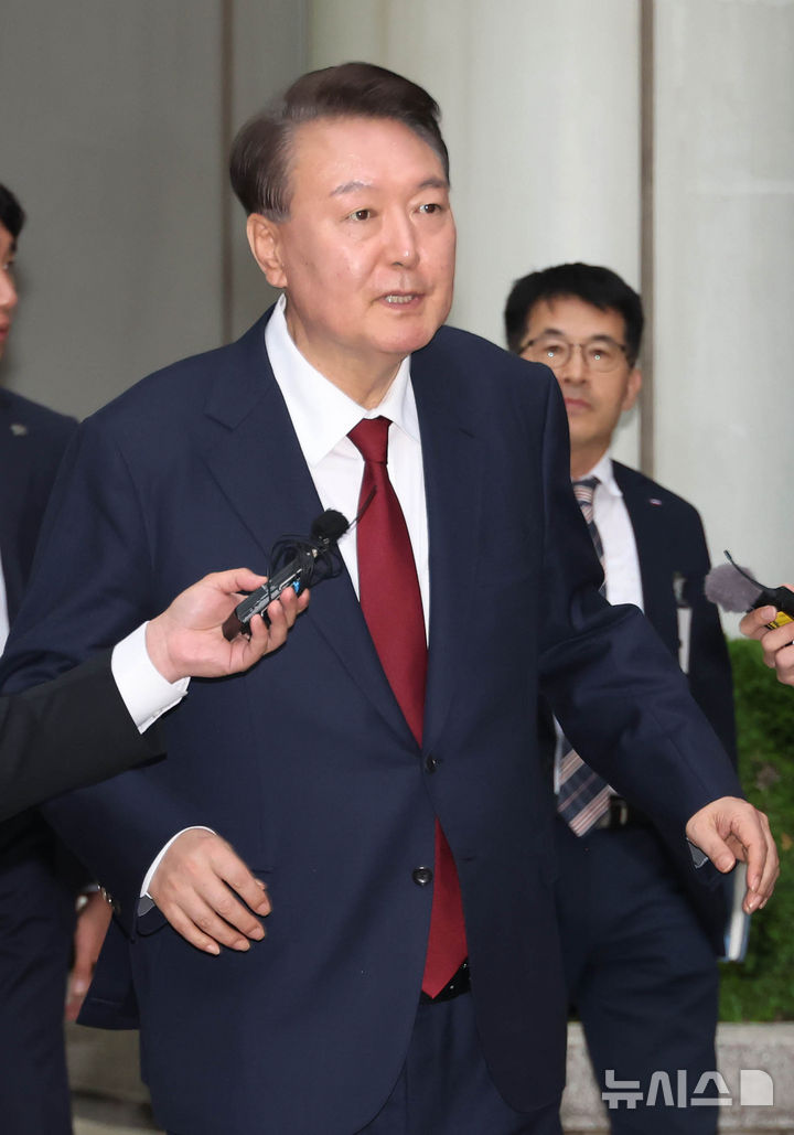 [서울=뉴시스] 사진공동취재단 = 윤석열 전 대통령이 19일 서울 서초구 중앙지방법원에서 열린 내란 우두머리 혐의, 직권남용 권리행사방해 혐의 사건 4차 공판을 마친 뒤 법정을 나서고 있다. 2025.05.19. [email protected]