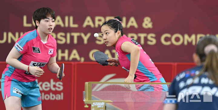 [도하(카타르)=뉴시스] 사진공동취재단 = 신유빈(오른쪽), 유한나가 19일 카타르 도하 카타르대학교 스포츠 컴플렉스에서 열린 2025 국제탁구연맹(ITTF) 세계선수권대회 여자복식 32강 조르지나 포타(헝가리), 드 누트(룩셈부르크) 조와 경기를 펼치고 있다. 2025.05.19. [email protected]