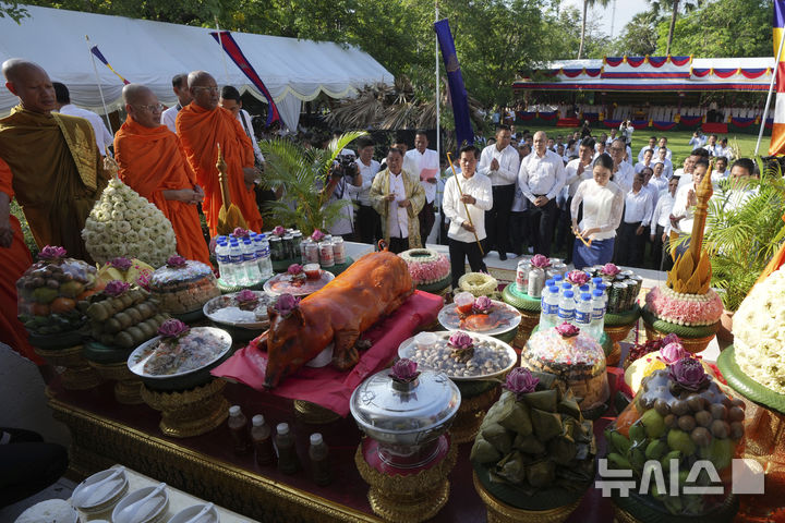 [프놈펜=AP/뉴시스] 20일(현지 시간) 캄보디아 프놈펜 교외 청아익 학살터에서 열린 크메르루주 희생자 추모 행사에서 프놈펜 시청 관계자들이 제를 올리고 있다. 청아익은 1975~79년 크메르루주 정권 시절 대량 학살이 자행된 대표적 ‘킬링 필드'(killing field)로, 양민 200만 명이 희생된 것으로 알려져 있다. 2025.05.20.