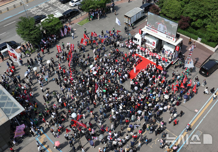 [서울=뉴시스]] 고승민 기자 = 김문수 국민의힘 대선 후보가 20일 서울 서초구 고속버스터미널 앞 광장에서 유세를 하고 있다. 2025.05.20. [email protected]