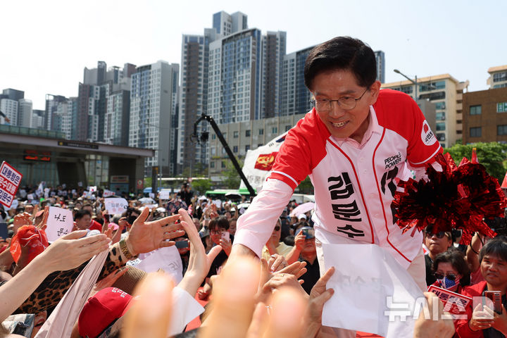 [서울=뉴시스]] 고승민 기자 = 김문수 국민의힘 대선 후보가 20일 서울 서초구 고속버스터미널 앞 광장에서 유세를 하고 있다. (공동취재) 2025.05.20. [email protected]