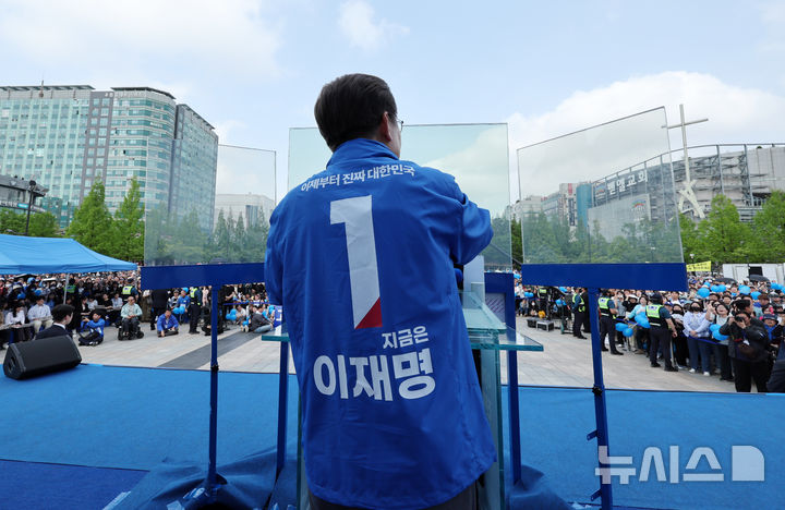 [고양=뉴시스] 조성우 기자 = 이재명 더불어민주당 대선후보가 20일 경기 고양시 일산동구 일산문화광장 앞에서 열린 집중유세에서 연설을 하고 있다. (공동취재) 2025.05.20. [email protected]