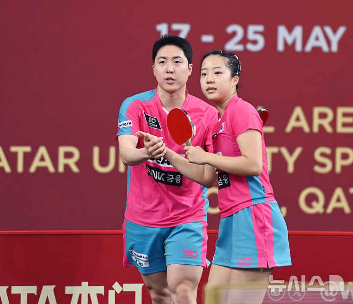 [도하(카타르)=뉴시스] 사진공동취재단 = 임종훈 신유빈이 20일 카타르 도하 카타르대학교 스포츠 컴플렉스에서 열린 2025 국제탁구연맹(ITTF) 세계선수권대회 혼합복식 16강 폴란드 사무엘 쿨치츠키-주잔나 비엘고스 조와 경기 승리 후 하이파이브를 하고 있다. 2025.05.20. [email protected]