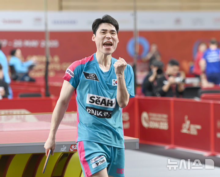 [도하(카타르)=뉴시스] 사진공동취재단 = 장우진이 20일 카타르 도하 카타르대학교 스포츠 컴플렉스에서 열린 2025 국제탁구연맹(ITTF) 세계선수권대회 남자단식 64강 이란 베냐민 파라지와 경기에서 득점 후 환호하고 있다. 2025.05.20. [email protected]